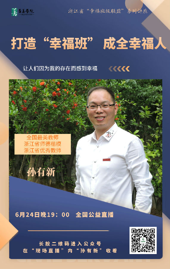 为了更好地发挥名班主任的示范辐射作用,加快班主任队伍建设,提高班主任的专业素养,孙有新名班主任工作室(第二期)第17次研修活动暨浙江省“幸福班级联盟”系列讲座在至善学院(教育直播平台)举行。活动时间2021年6月24日——6月27日,共4天。在活动中,本工作室主持人孙有新老师联合浙江省衢州第一中学刘强老师、嵊州市马寅初中学袁聪老师、浙江省绍兴市阳明中学张洁老师分别带来了专题讲座《打造“幸福班”,成全幸福人》 《打造幸福班级,收获职业幸福》 《构建幸福教室,打造幸福班级》 《幸福力主题班会的设计与实施》。