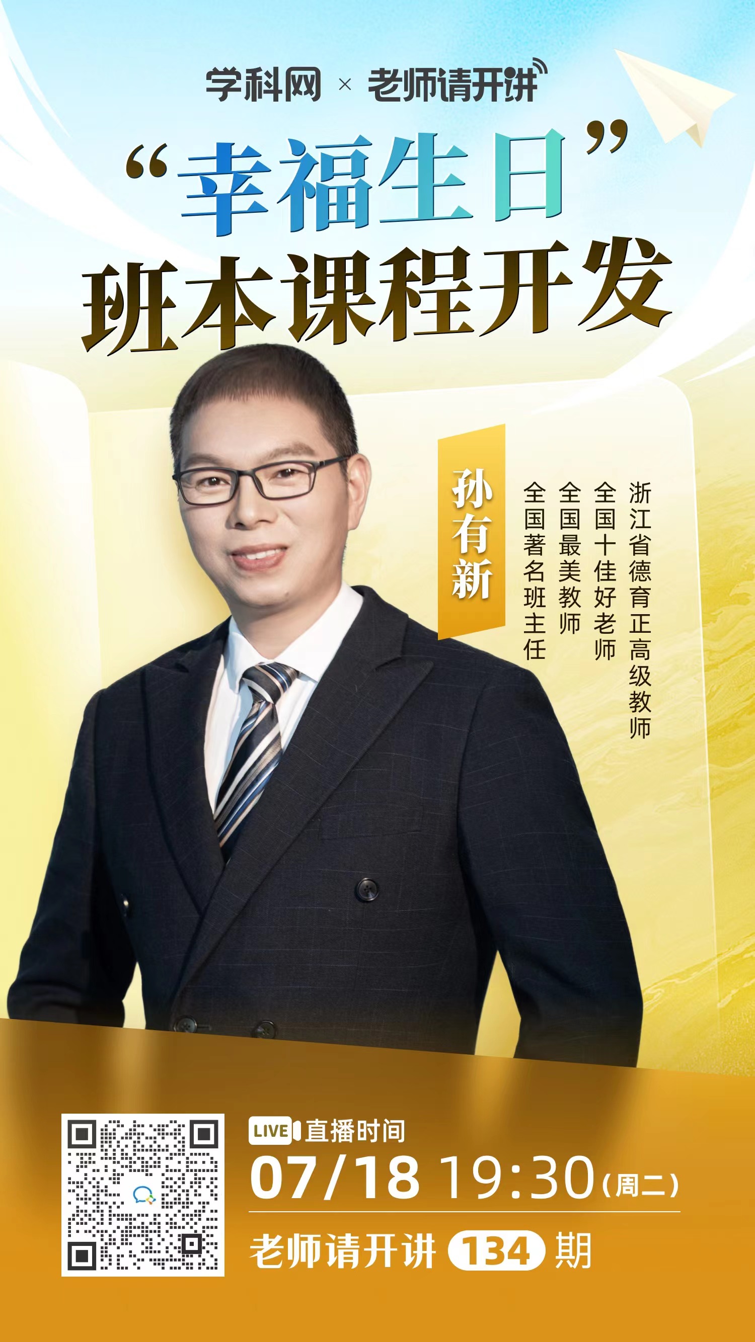 主讲:孙有新,德育正高级教师,浙江师范大学附属瑞安高级中学(瑞安市第五中学)班主任、思想政治教师,浙江省首批中小学班主任工作室领衔人、浙江省名师网络工作室领衔人《教师博览》《瑞安慈善》封面人物《德育报》“班主任之星”。自从1999年参加工作以来,一直担任班主任。他荣获全国十佳好老师、全国最美教师、浙江省师德楷模、浙江省优秀教师、新时代浙江省“万名好党员”、温州市名班主任、温州市最美老师、瑞安市首届功勋班主任等20多项县级以上荣誉称号,荣获2014年浙江省中小学班主任基本功大赛高中组第一名。所带班级多次被评为温州市先进班集体、瑞安市先进班集体。曾参与编写8本教育著作,30多篇文章在省级报刊上发表,在全国各地演讲130多场。他的先进事迹被学习强国、教育部新闻办官微、中国教育报等70多家媒体报道。